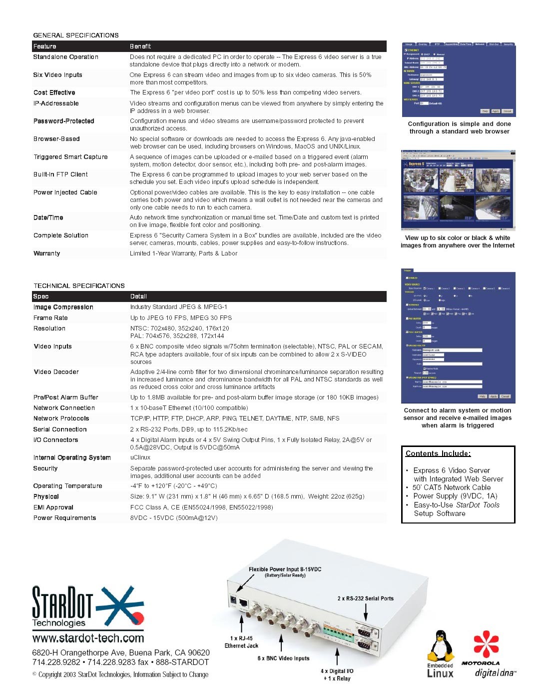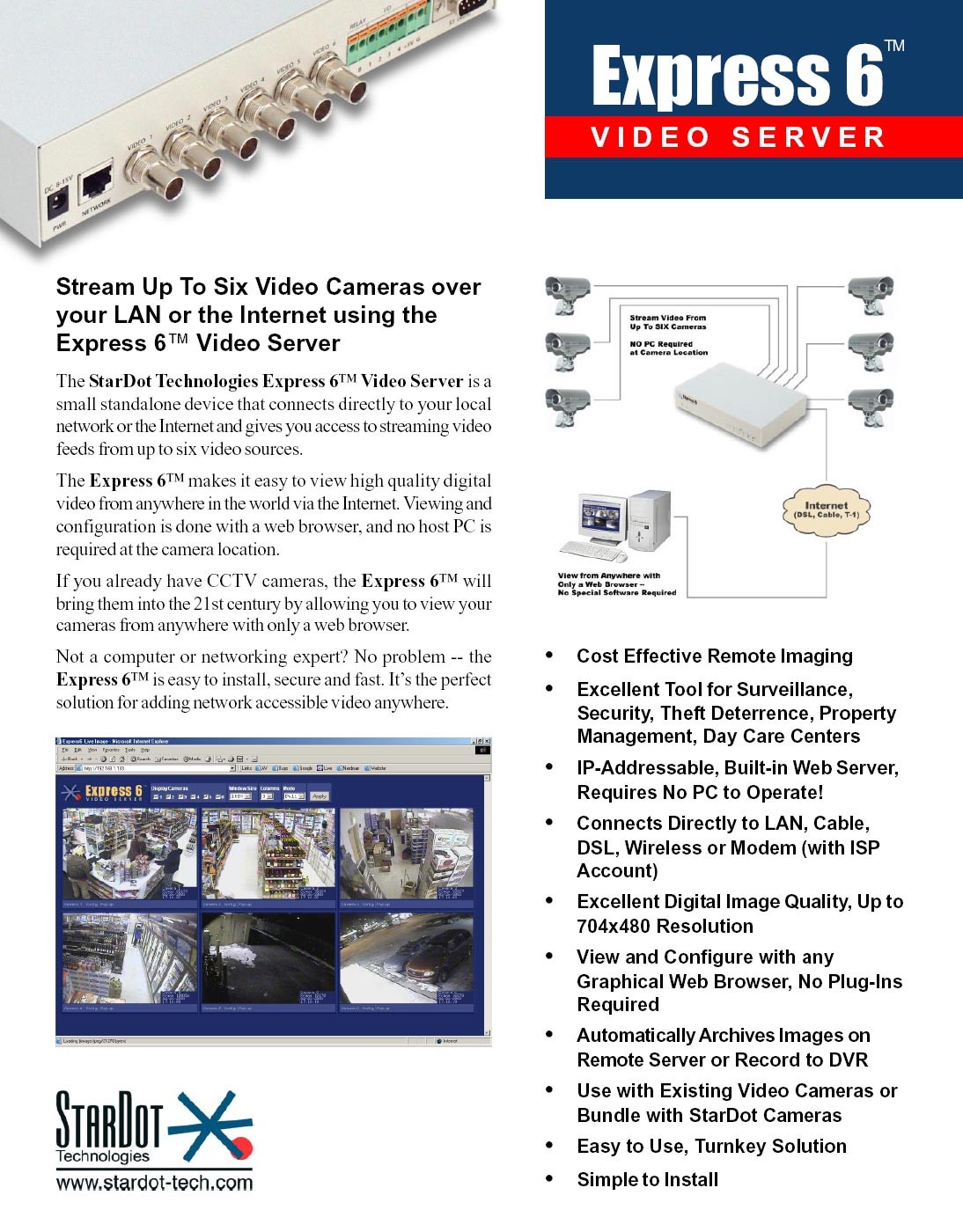 cameras from anywhere in the world, something not possible with traditional security system technology. The Express 6 Video Server is available now for $595. For a complete list of accessories and pricing, see the order form. If you'd like to discuss your video imaging application, call us toll free at 1-888-782-7368 or take a moment and fill out our Client Requirements Form. StarDot offers complete solutions that include the Express 6 server and your choice of low-cost video cameras and cables. Have a specific application? Take a few seconds to fill out our Client Requirements Form. If your application requires high resolution live images or standalone network cameras, be sure to check out our NetCam line of network cameras. |